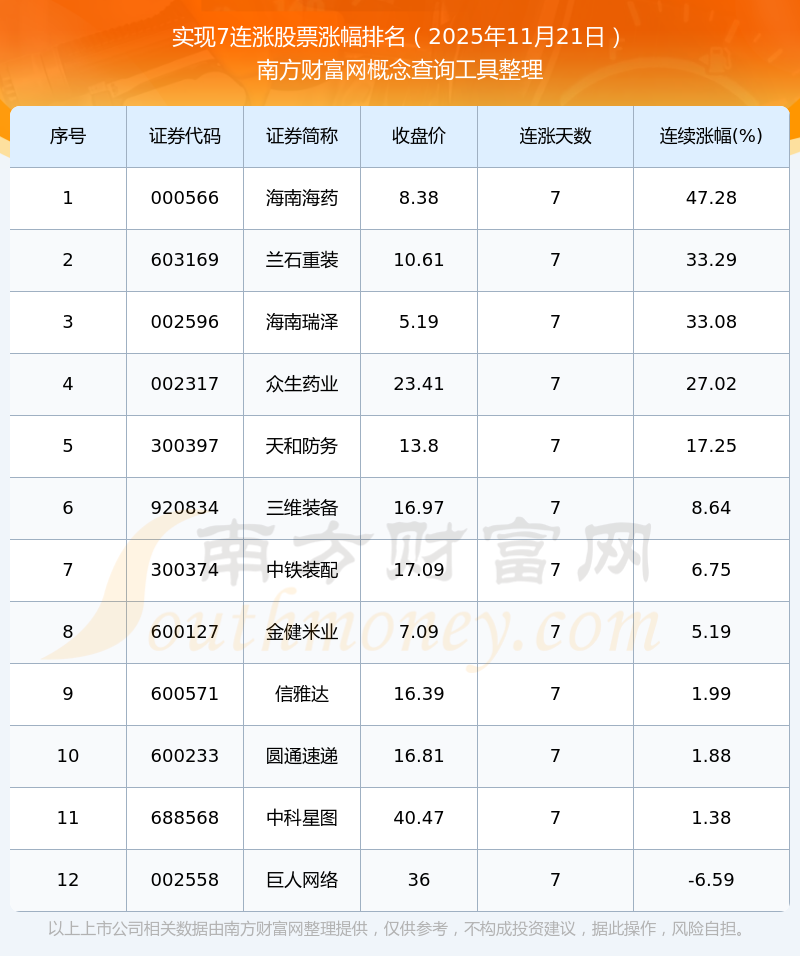 根據(jù)南方財(cái)富網(wǎng)概念查詢工具數(shù)據(jù)統(tǒng)計(jì),截止2025年11月21日收盤,共有12只個(gè)股實(shí)現(xiàn)7天連漲。其中連續(xù)漲幅較大的個(gè)股有海南海藥、蘭石重裝、海南瑞澤等,連續(xù)漲幅分別為47.28%、33.29%、33.08%。