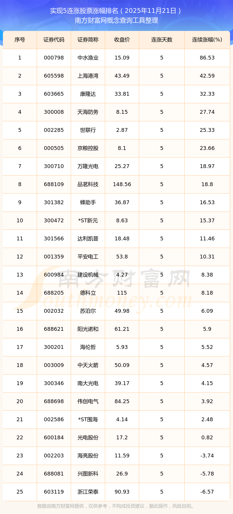 根據(jù)南方財富網(wǎng)概念查詢工具數(shù)據(jù)統(tǒng)計,截止2025年11月21日收盤,共有25只個股實現(xiàn)5天連漲。其中連續(xù)漲幅較大的個股有中水漁業(yè)、上海港灣、康隆達(dá)等,連續(xù)漲幅分別為86.53%、42.59%、32.33%。