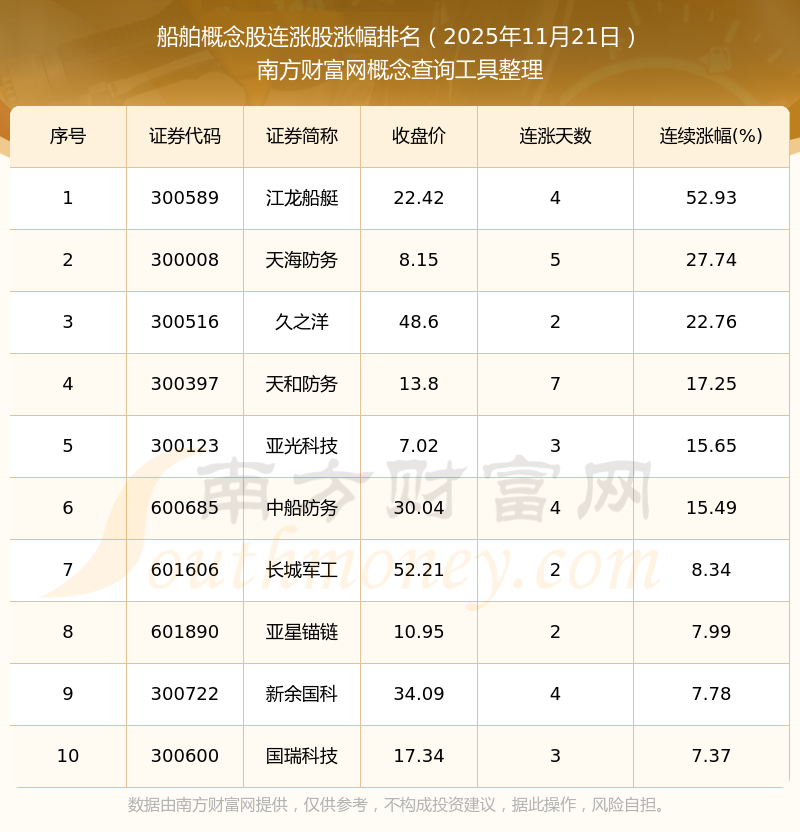 根據(jù)南方財富網(wǎng)概念查詢工具數(shù)據(jù)統(tǒng)計,截止2025年11月21日收盤,船舶概念股共有10只個股實現(xiàn)連漲。其中連續(xù)漲幅較大的個股有江龍船艇、天海防務(wù)、久之洋等,連續(xù)漲幅分別為52.93%、27.74%、22.76%。