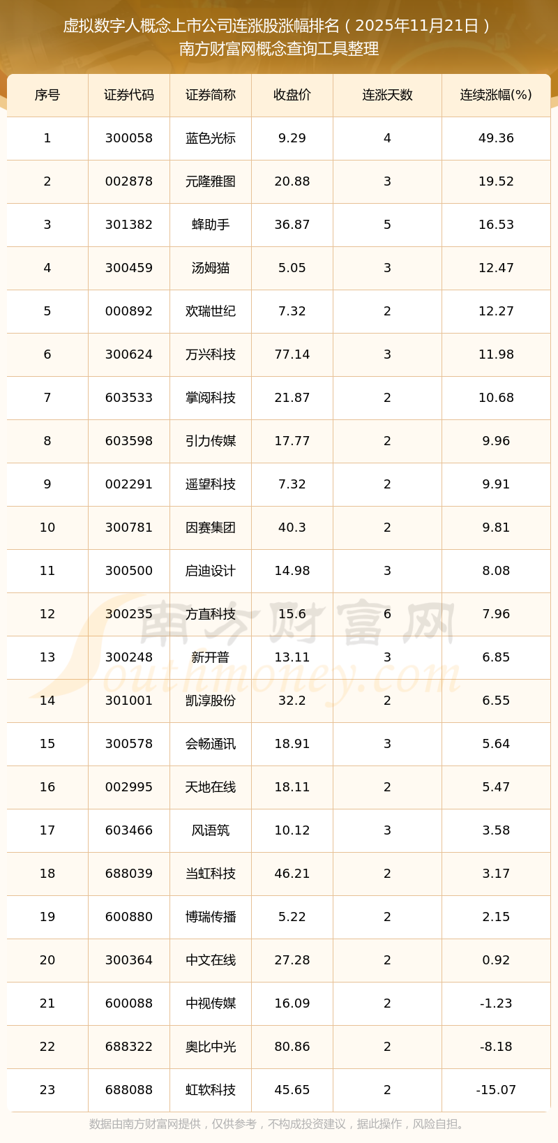 2025年11月21日虛擬數(shù)字人概念上市公司連漲股漲幅排名