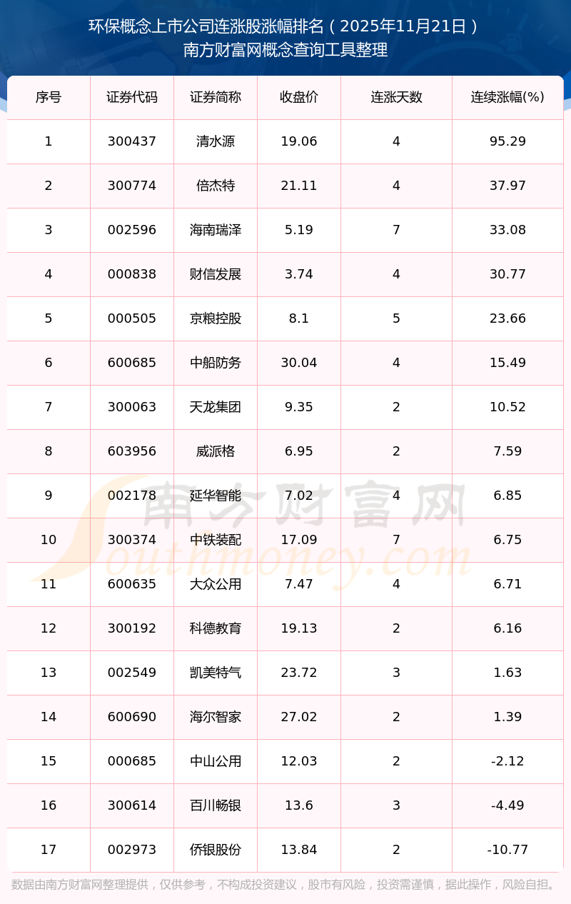 2025年11月21日環(huán)保概念上市公司連漲股票漲幅排名