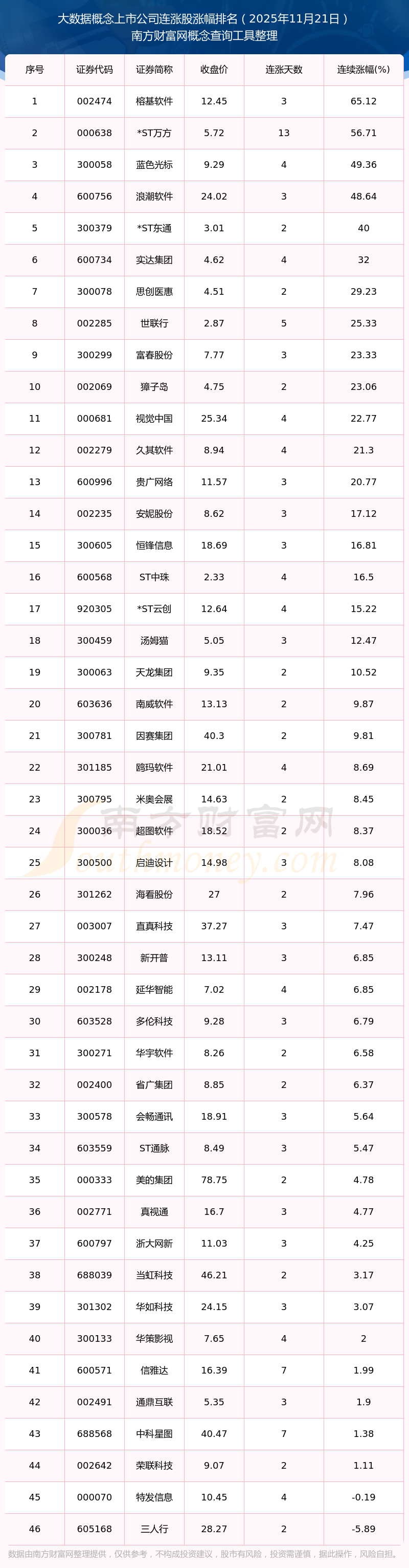 2025年11月21日大數(shù)據(jù)概念上市公司連漲股漲幅排名