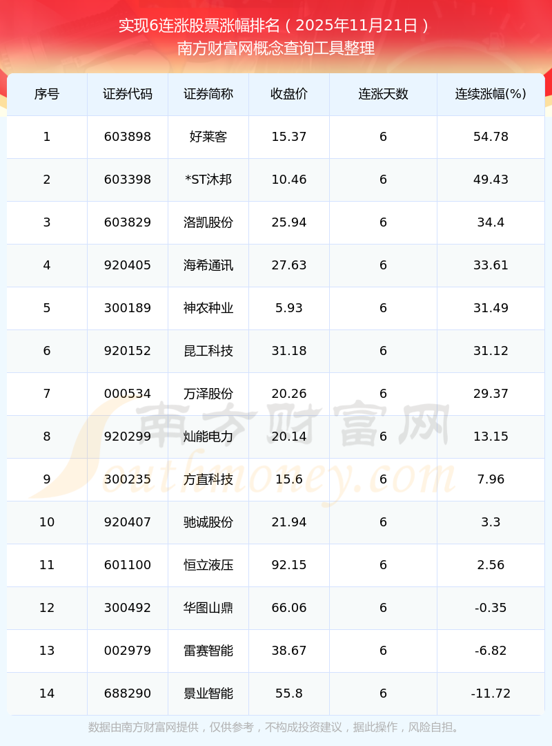 根據(jù)南方財(cái)富網(wǎng)概念查詢工具數(shù)據(jù)統(tǒng)計(jì),截止2025年11月21日收盤,共有14只個(gè)股實(shí)現(xiàn)6天連漲。其中連續(xù)漲幅較大的個(gè)股有好萊客、*ST沐邦、洛凱股份等,連續(xù)漲幅分別為54.78%、49.43%、34.40%。
