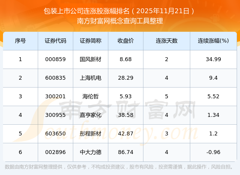 根據(jù)南方財(cái)富網(wǎng)概念查詢工具數(shù)據(jù)統(tǒng)計(jì),截止2025年11月21日收盤,包裝上市公司共有6只個(gè)股實(shí)現(xiàn)連漲。其中連續(xù)漲幅較大的個(gè)股有國風(fēng)新材、上海機(jī)電、海倫哲等,連續(xù)漲幅分別為34.99%、9.40%、5.52%。