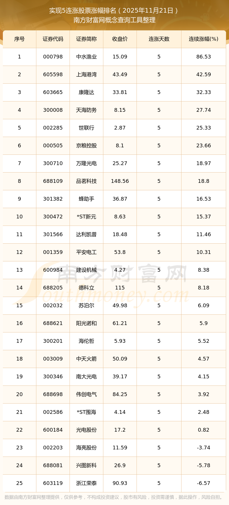2025年11月21日實(shí)現(xiàn)5連漲股票漲幅排名