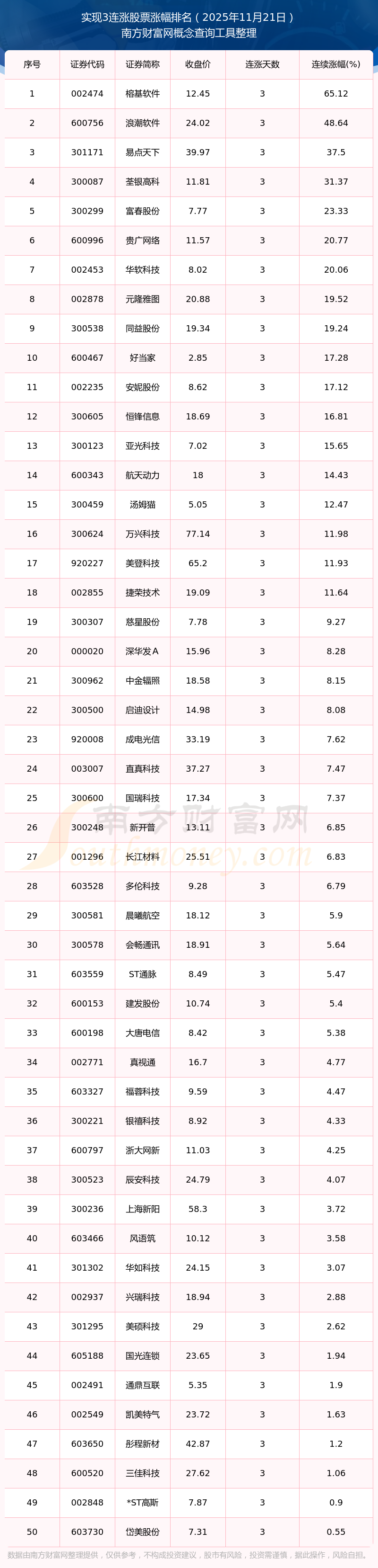 根據南方財富網概念查詢工具數據統(tǒng)計,截止2025年11月21日收盤,共有75只個股實現(xiàn)3天連漲。其中連續(xù)漲幅較大的個股有榕基軟件、浪潮軟件、易點天下等,連續(xù)漲幅分別為65.12%、48.64%、37.50%。