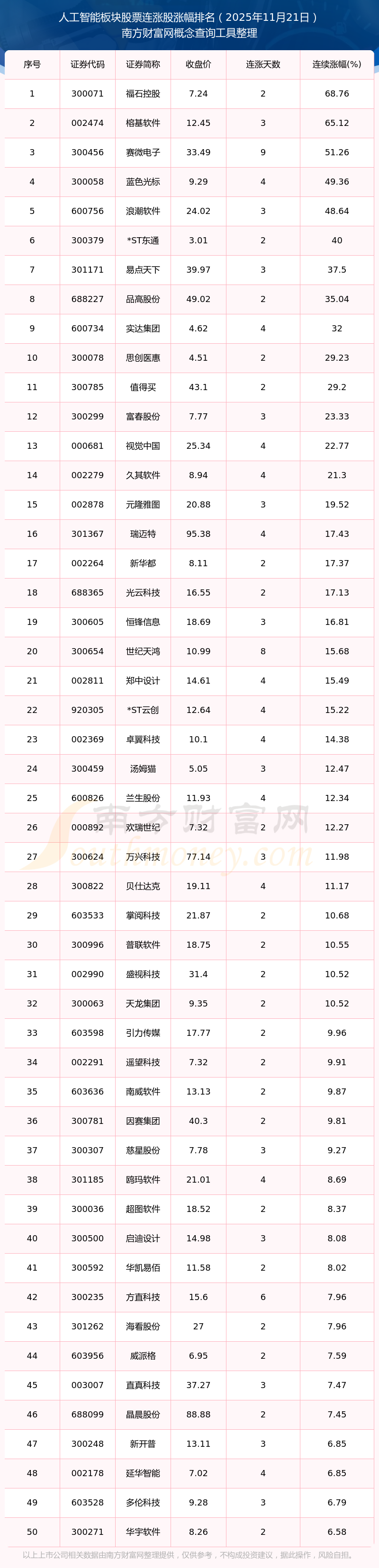 根據(jù)南方財(cái)富網(wǎng)概念查詢(xún)工具數(shù)據(jù)統(tǒng)計(jì),截止2025年11月21日收盤(pán),人工智能板塊股票共有109只個(gè)股實(shí)現(xiàn)連漲。其中連續(xù)漲幅較大的個(gè)股有福石控股、榕基軟件、賽微電子等,連續(xù)漲幅分別為68.76%、65.12%、51.26%。