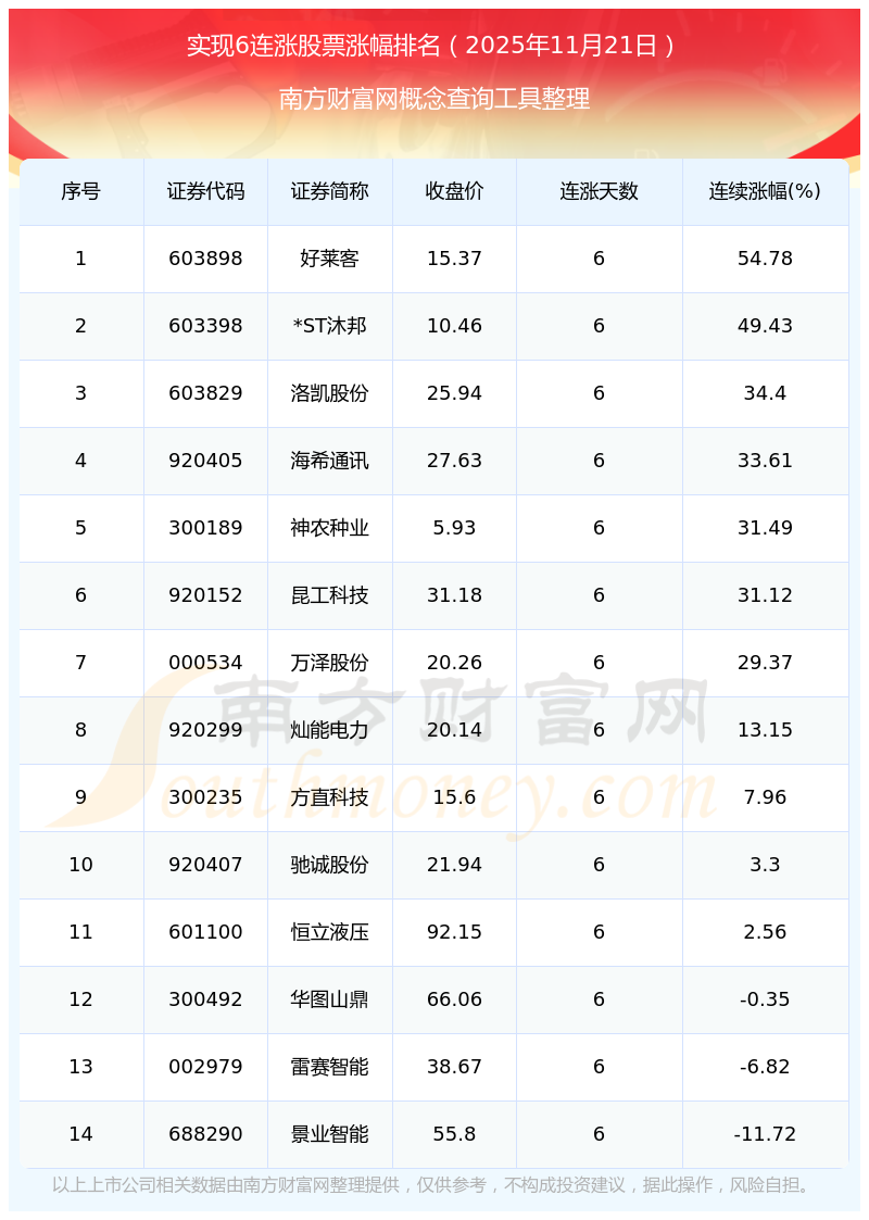 2025年11月21日實(shí)現(xiàn)6連漲股票漲幅排名