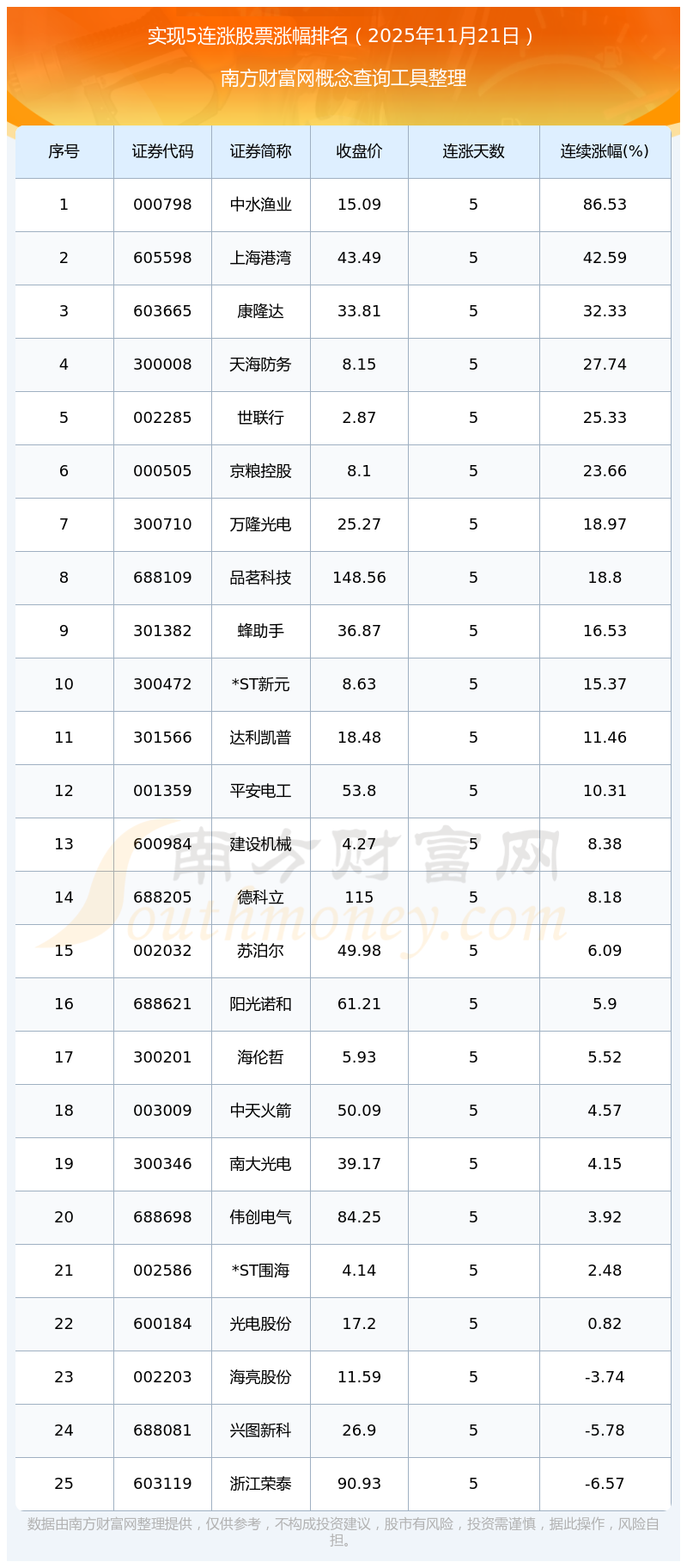 根據南方財富網概念查詢工具數據統(tǒng)計,截止2025年11月21日收盤,共有25只個股實現5天連漲。其中連續(xù)漲幅較大的個股有中水漁業(yè)、上海港灣、康隆達等,連續(xù)漲幅分別為86.53%、42.59%、32.33%。