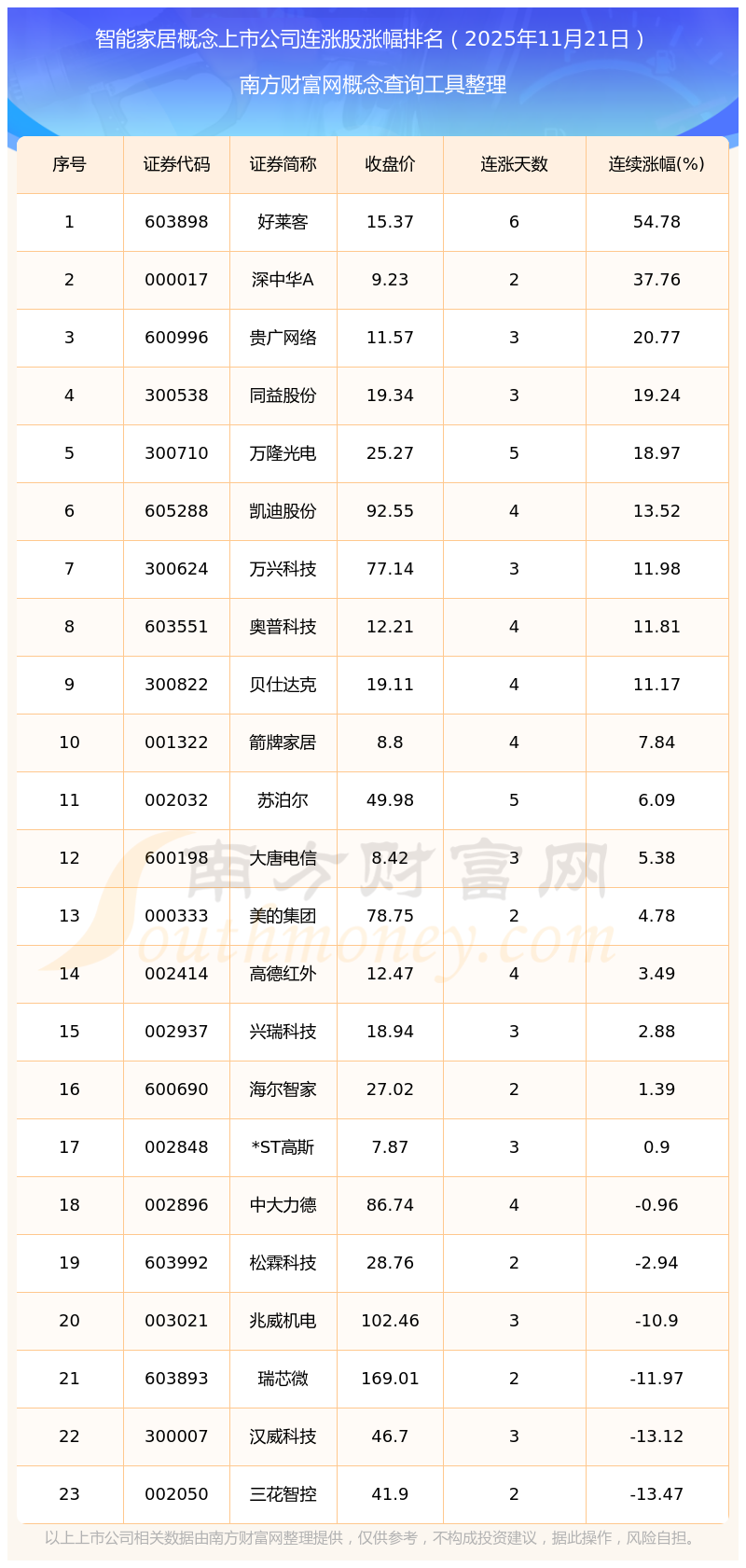 2025年11月21日智能家居概念上市公司連漲股漲幅排名