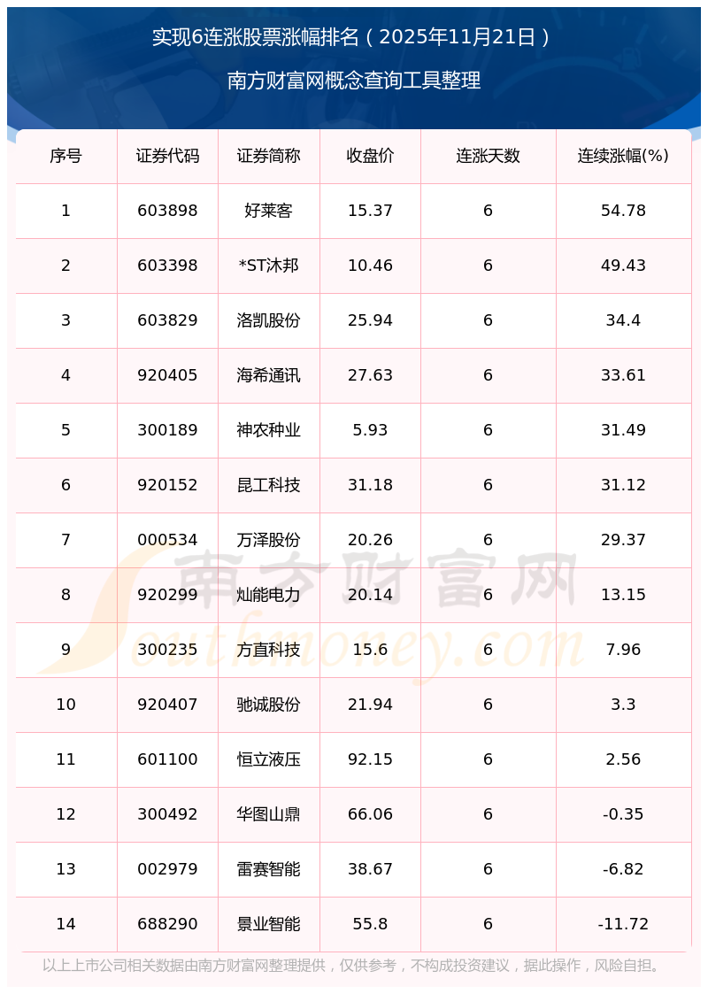 根據(jù)南方財富網(wǎng)概念查詢工具數(shù)據(jù)統(tǒng)計,截止2025年11月21日收盤,共有14只個股實現(xiàn)6天連漲。其中連續(xù)漲幅較大的個股有好萊客、*ST沐邦、洛凱股份等,連續(xù)漲幅分別為54.78%、49.43%、34.40%。