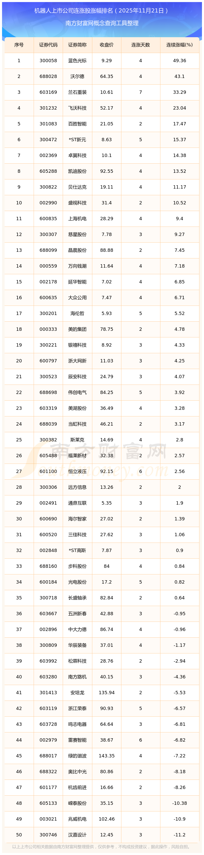 2025年11月21日機器人上市公司連漲股漲幅排名