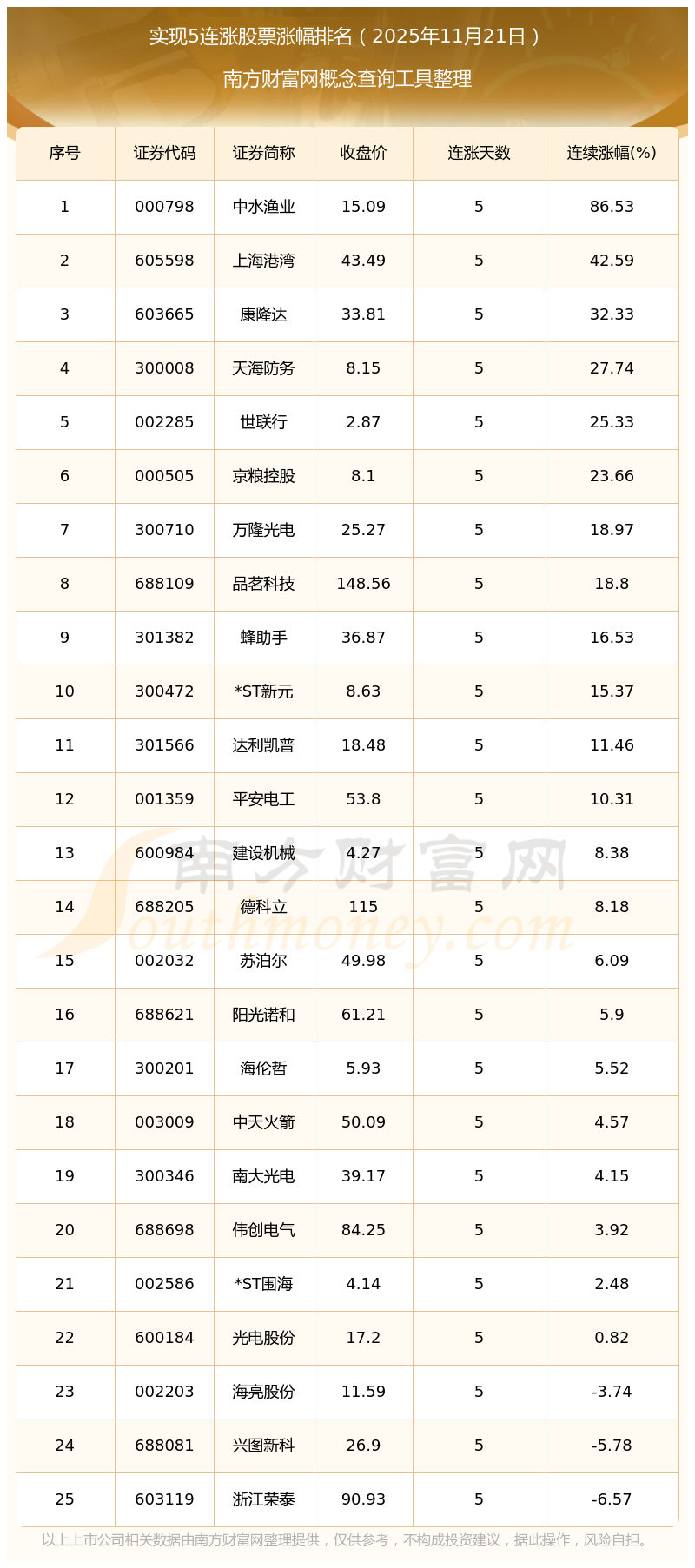 根據(jù)南方財富網(wǎng)概念查詢工具數(shù)據(jù)統(tǒng)計,截止2025年11月21日收盤,共有25只個股實現(xiàn)5天連漲。其中連續(xù)漲幅較大的個股有中水漁業(yè)、上海港灣、康隆達(dá)等,連續(xù)漲幅分別為86.53%、42.59%、32.33%。