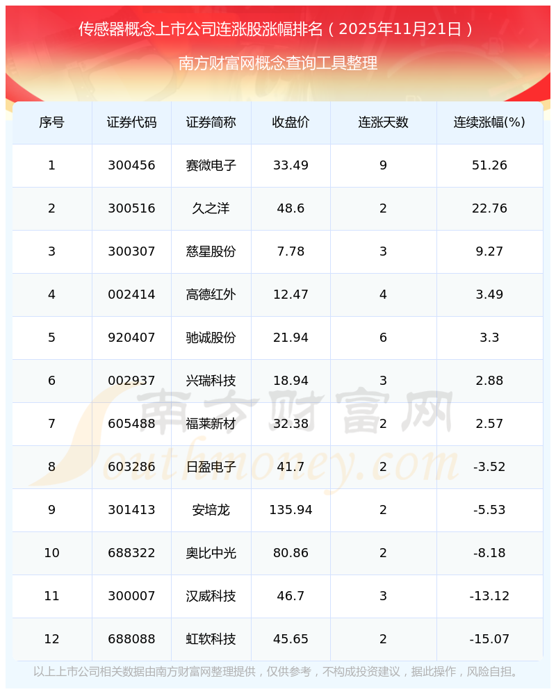 根據(jù)南方財(cái)富網(wǎng)概念查詢工具數(shù)據(jù)統(tǒng)計(jì),截止2025年11月21日收盤,傳感器概念上市公司共有12只個(gè)股實(shí)現(xiàn)連漲。其中連續(xù)漲幅較大的個(gè)股有賽微電子、久之洋、慈星股份等,連續(xù)漲幅分別為51.26%、22.76%、9.27%。