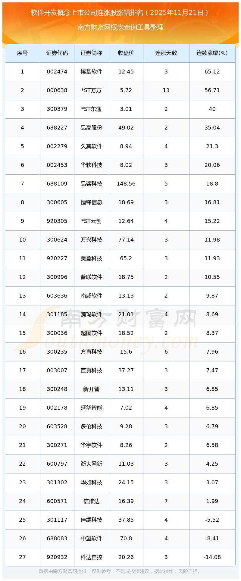 2025年11月21日軟件開發(fā)概念上市公司連漲股漲幅排名