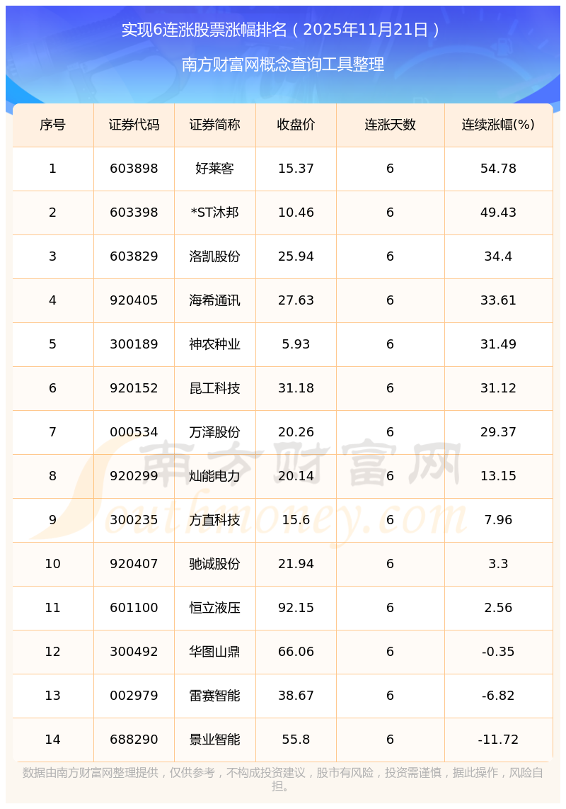 2025年11月21日實現(xiàn)6連漲股票漲幅排名