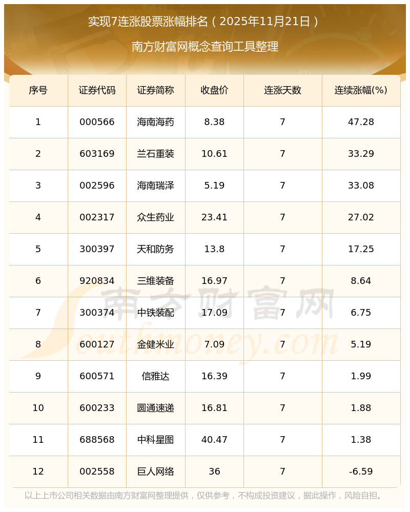 根據(jù)南方財富網(wǎng)概念查詢工具數(shù)據(jù)統(tǒng)計,截止2025年11月21日收盤,共有12只個股實現(xiàn)7天連漲。其中連續(xù)漲幅較大的個股有海南海藥、蘭石重裝、海南瑞澤等,連續(xù)漲幅分別為47.28%、33.29%、33.08%。