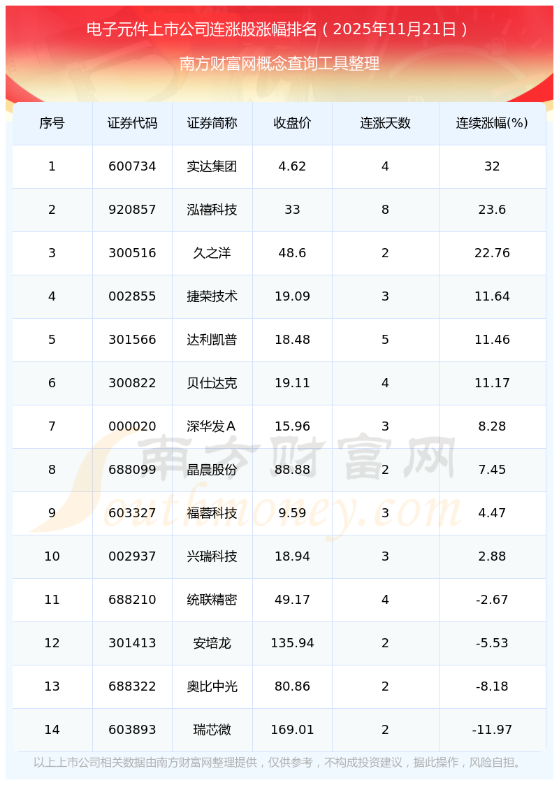 2025年11月21日電子元件上市公司連漲股漲幅排名