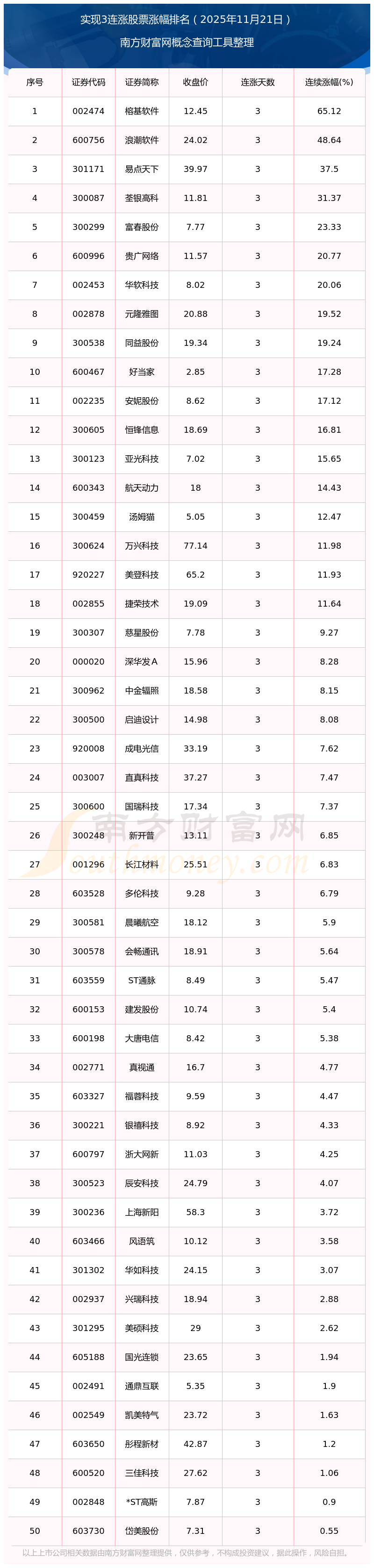 根據(jù)南方財富網(wǎng)概念查詢工具數(shù)據(jù)統(tǒng)計,截止2025年11月21日收盤,共有75只個股實(shí)現(xiàn)3天連漲。其中連續(xù)漲幅較大的個股有榕基軟件、浪潮軟件、易點(diǎn)天下等,連續(xù)漲幅分別為65.12%、48.64%、37.50%。