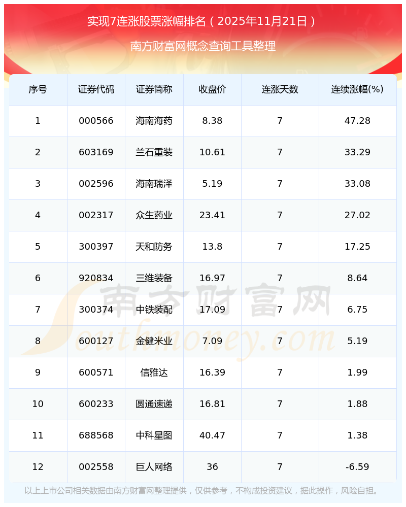 2025年11月21日實(shí)現(xiàn)7連漲股票漲幅排名