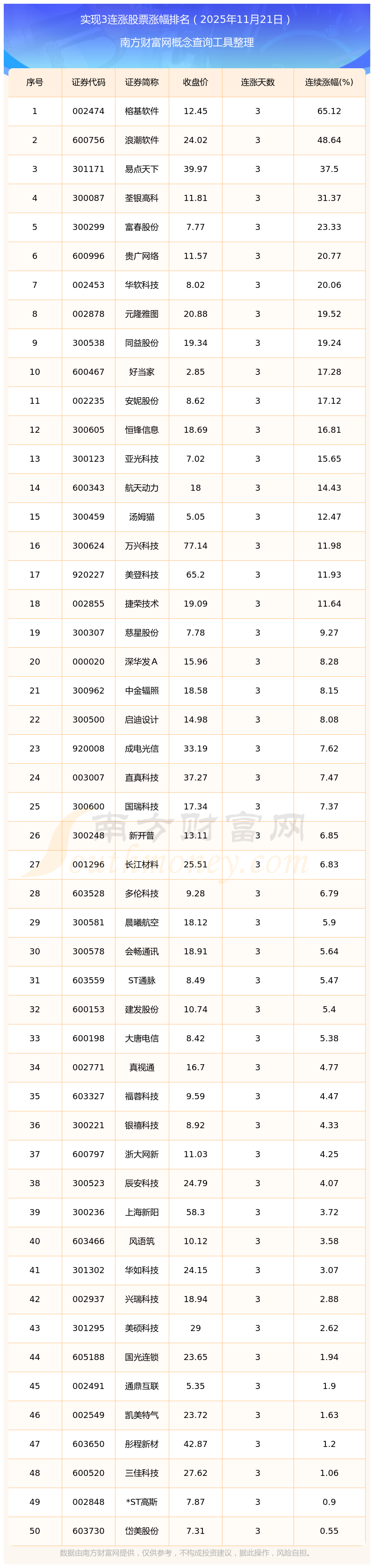 2025年11月21日實(shí)現(xiàn)3連漲股票漲幅排名