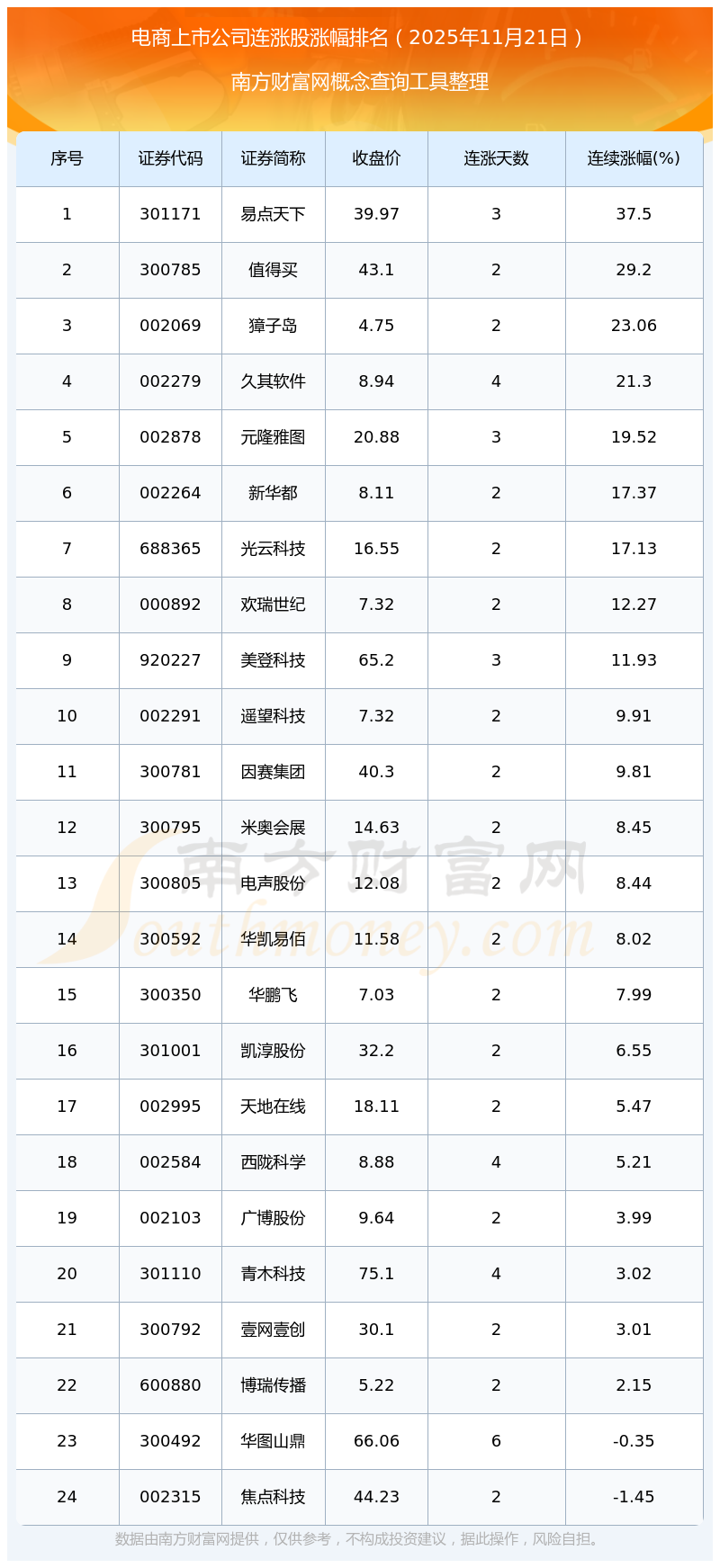 2025年11月21日電商上市公司連漲股票漲幅排名