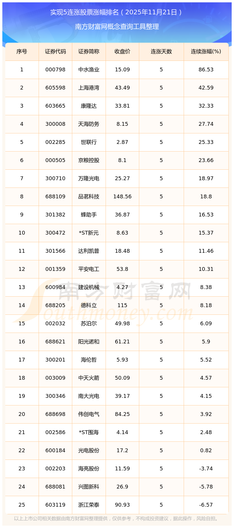 根據(jù)南方財(cái)富網(wǎng)概念查詢工具數(shù)據(jù)統(tǒng)計(jì),截止2025年11月21日收盤,共有25只個(gè)股實(shí)現(xiàn)5天連漲。其中連續(xù)漲幅較大的個(gè)股有中水漁業(yè)、上海港灣、康隆達(dá)等,連續(xù)漲幅分別為86.53%、42.59%、32.33%。