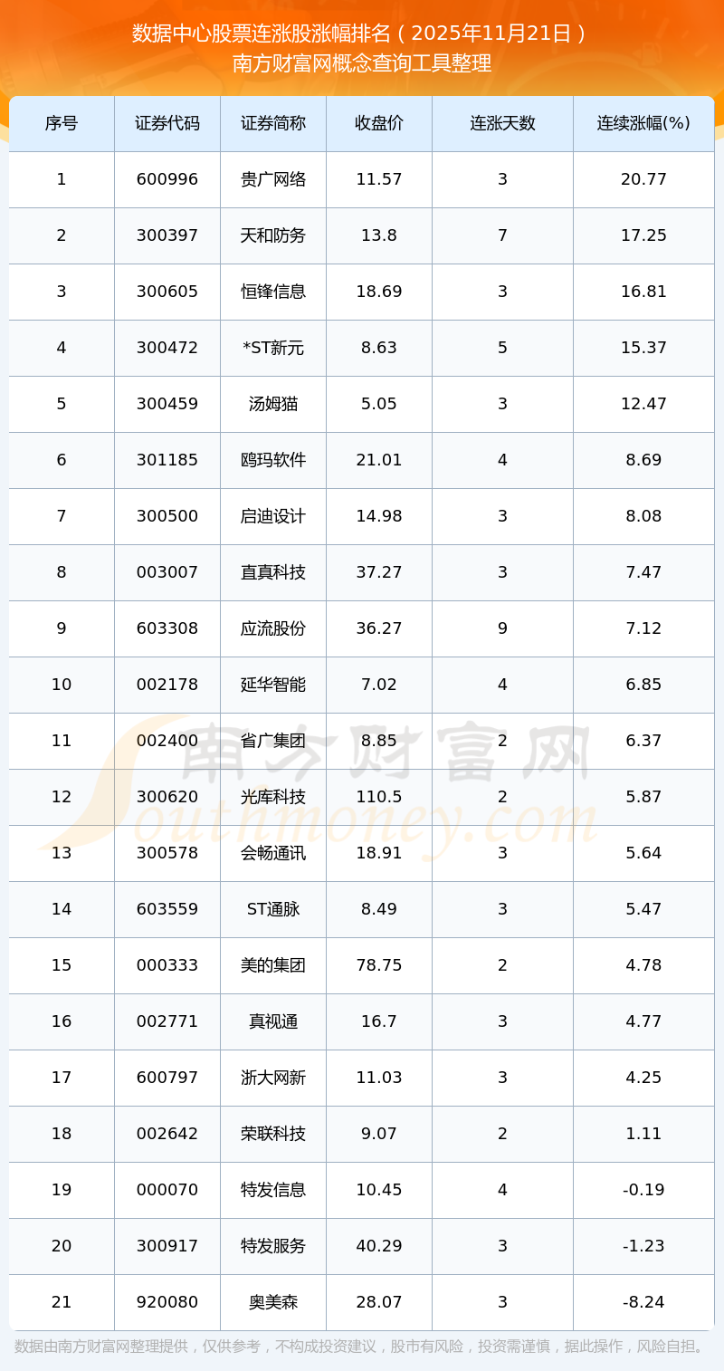根據南方財富網概念查詢工具數據統(tǒng)計,截止2025年11月21日收盤,數據中心股票共有21只個股實現連漲。其中連續(xù)漲幅較大的個股有貴廣網絡、天和防務、恒鋒信息等,連續(xù)漲幅分別為20.77%、17.25%、16.81%。