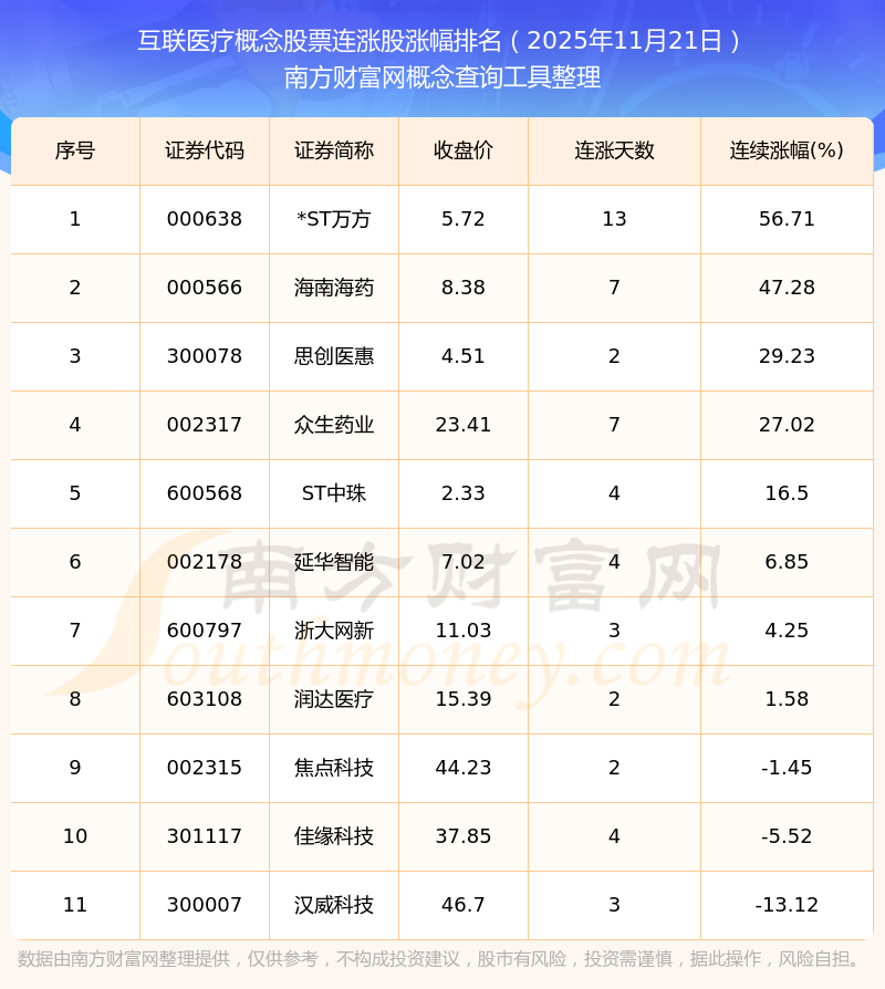 2025年11月21日互聯(lián)醫(yī)療概念股票連漲股漲幅排名