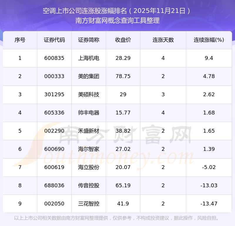 2025年11月21日空調(diào)上市公司連漲股漲幅排名