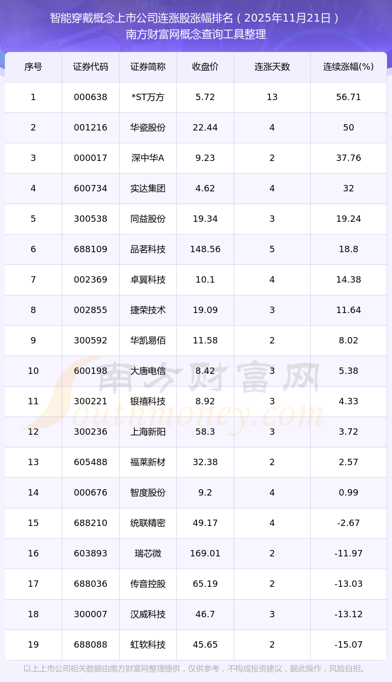 根據(jù)南方財(cái)富網(wǎng)概念查詢工具數(shù)據(jù)統(tǒng)計(jì),截止2025年11月21日收盤,智能穿戴概念上市公司共有19只個(gè)股實(shí)現(xiàn)連漲。其中連續(xù)漲幅較大的個(gè)股有*ST萬(wàn)方、華瓷股份、深中華A等,連續(xù)漲幅分別為56.71%、50.00%、37.76%。