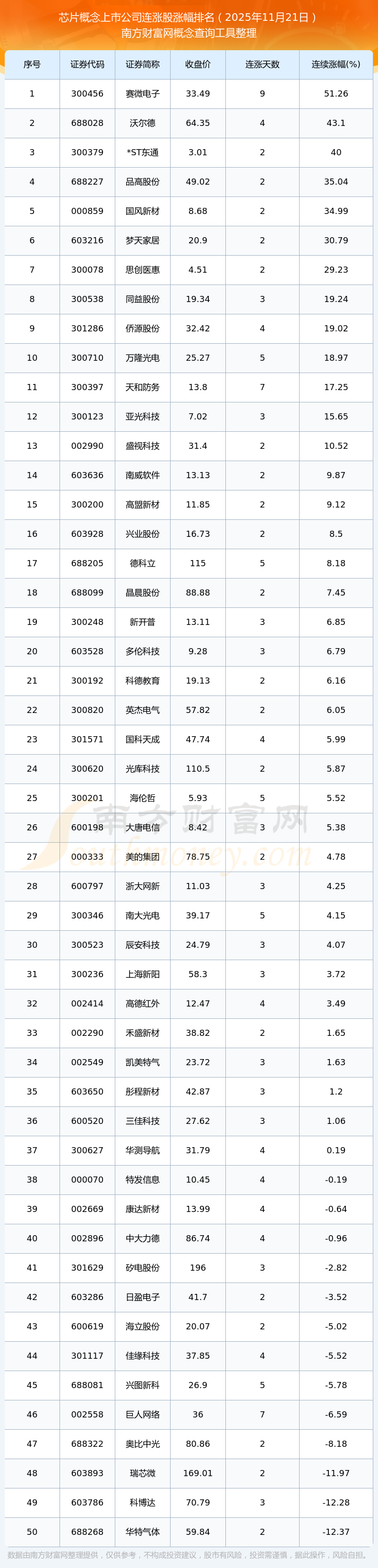根據(jù)南方財富網(wǎng)概念查詢工具數(shù)據(jù)統(tǒng)計,截止2025年11月21日收盤,芯片概念上市公司共有52只個股實(shí)現(xiàn)連漲。其中連續(xù)漲幅較大的個股有賽微電子、沃爾德、*ST東通等,連續(xù)漲幅分別為51.26%、43.10%、40.00%。