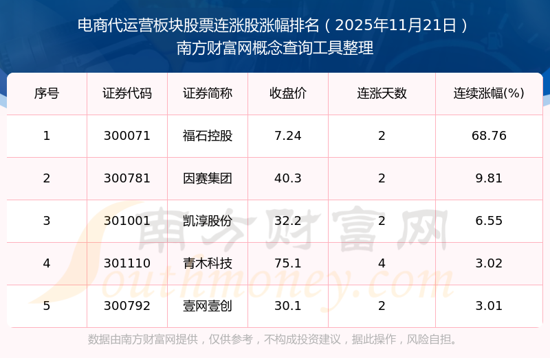2025年11月21日電商代運(yùn)營(yíng)板塊股票連漲股漲幅排名