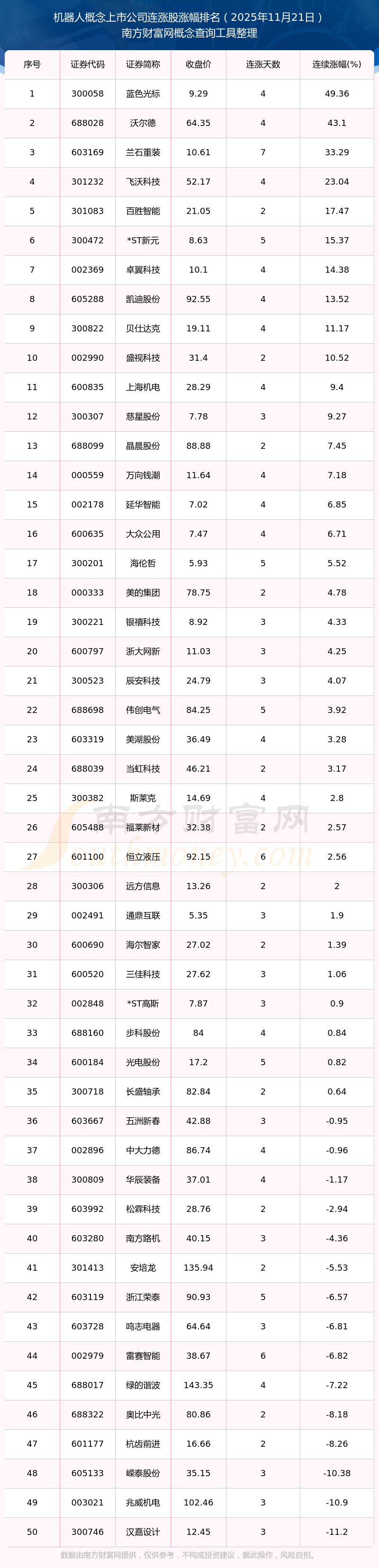 2025年11月21日機器人概念上市公司連漲股漲幅排名