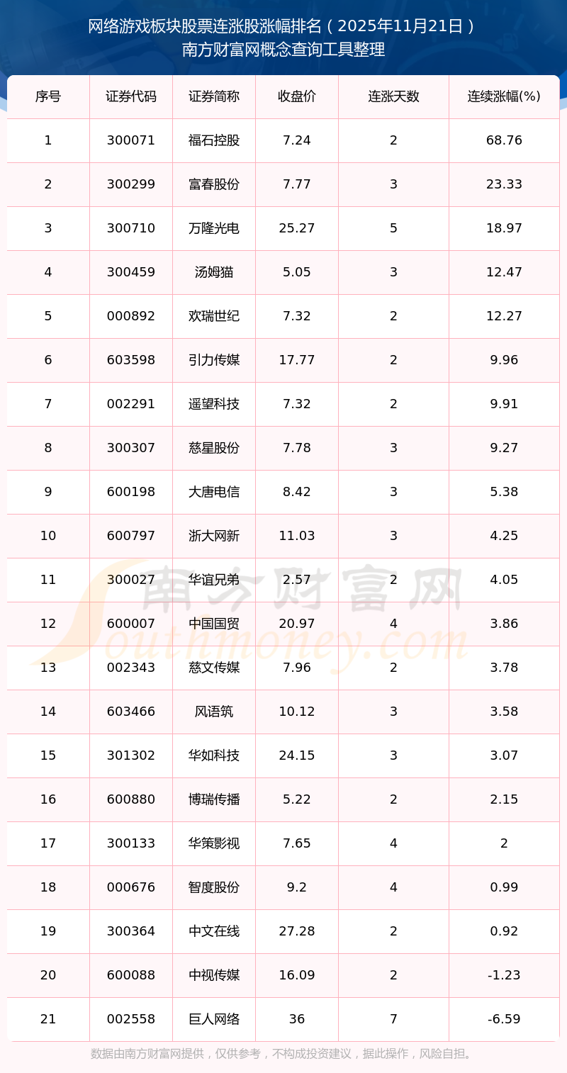 根據(jù)南方財富網(wǎng)概念查詢工具數(shù)據(jù)統(tǒng)計,截止2025年11月21日收盤,網(wǎng)絡(luò)游戲板塊股票共有21只個股實現(xiàn)連漲。其中連續(xù)漲幅較大的個股有福石控股、富春股份、萬隆光電等,連續(xù)漲幅分別為68.76%、23.33%、18.97%。