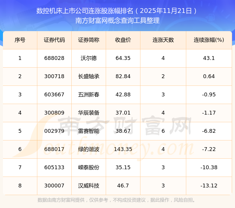 2025年11月21日數(shù)控機床上市公司連漲股漲幅排名