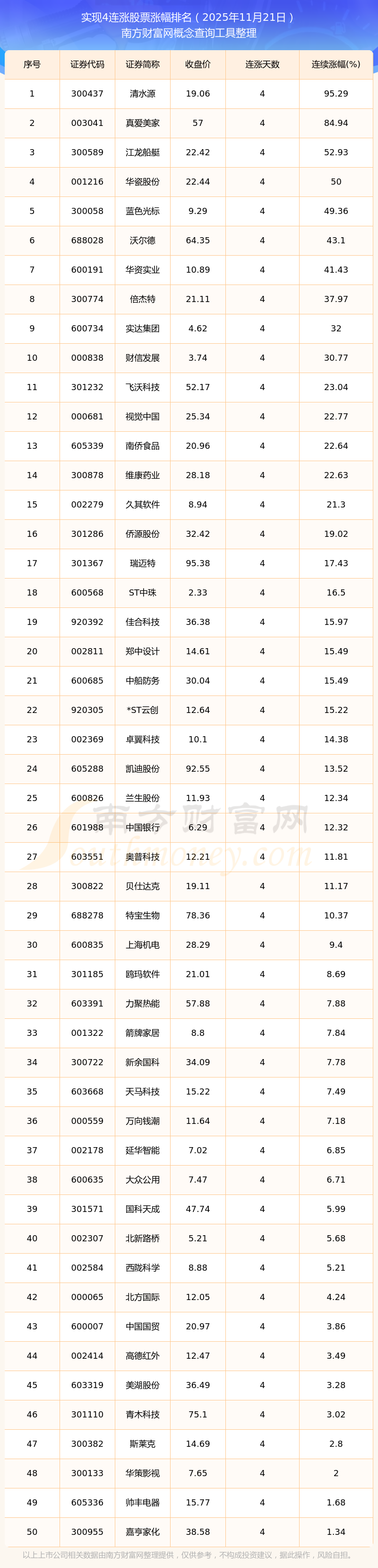 2025年11月21日實(shí)現(xiàn)4連漲股票漲幅排名