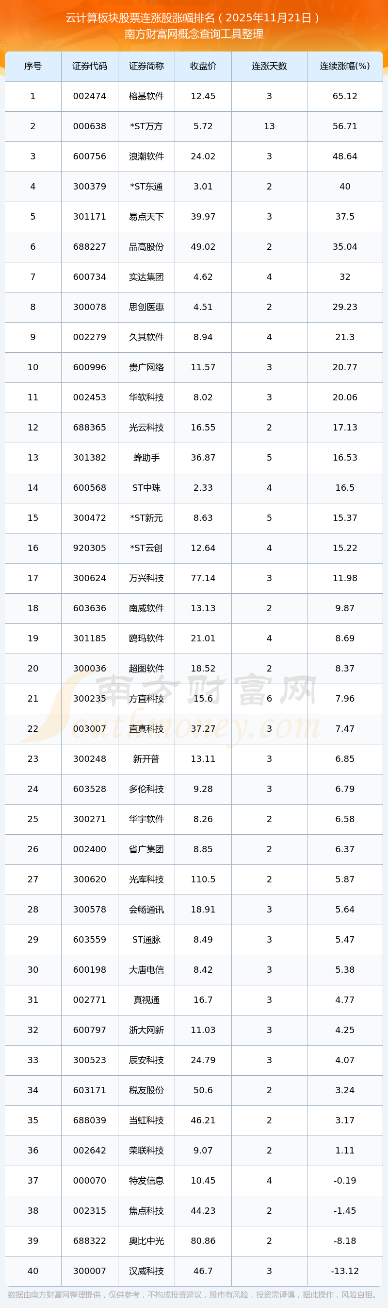 2025年11月21日云計(jì)算板塊股票連漲股漲幅排名