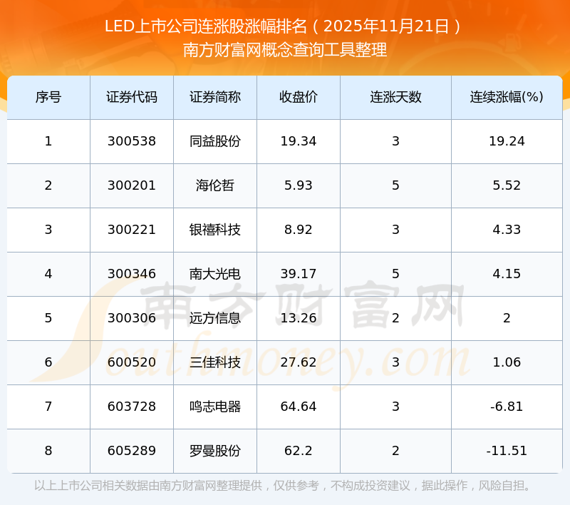 2025年11月21日LED上市公司連漲股漲幅排名
