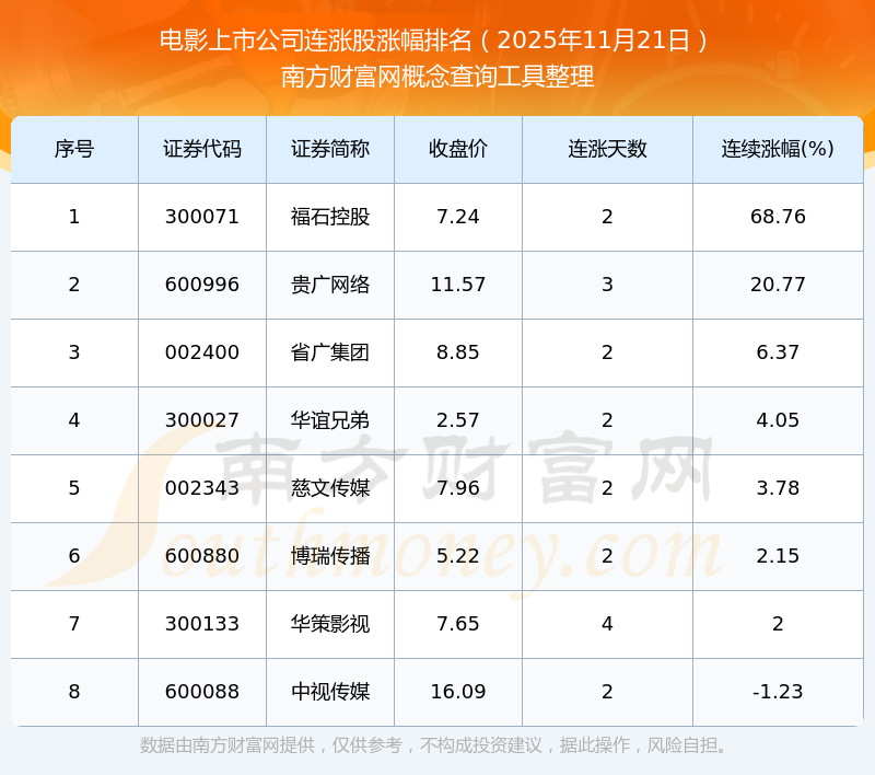 根據(jù)南方財富網(wǎng)概念查詢工具數(shù)據(jù)統(tǒng)計,截止2025年11月21日收盤,電影上市公司共有8只個股實現(xiàn)連漲。其中連續(xù)漲幅較大的個股有福石控股、貴廣網(wǎng)絡(luò)、省廣集團等,連續(xù)漲幅分別為68.76%、20.77%、6.37%。
