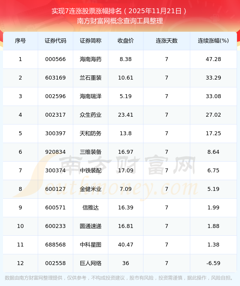 根據(jù)南方財富網(wǎng)概念查詢工具數(shù)據(jù)統(tǒng)計,截止2025年11月21日收盤,共有12只個股實現(xiàn)7天連漲。其中連續(xù)漲幅較大的個股有海南海藥、蘭石重裝、海南瑞澤等,連續(xù)漲幅分別為47.28%、33.29%、33.08%。