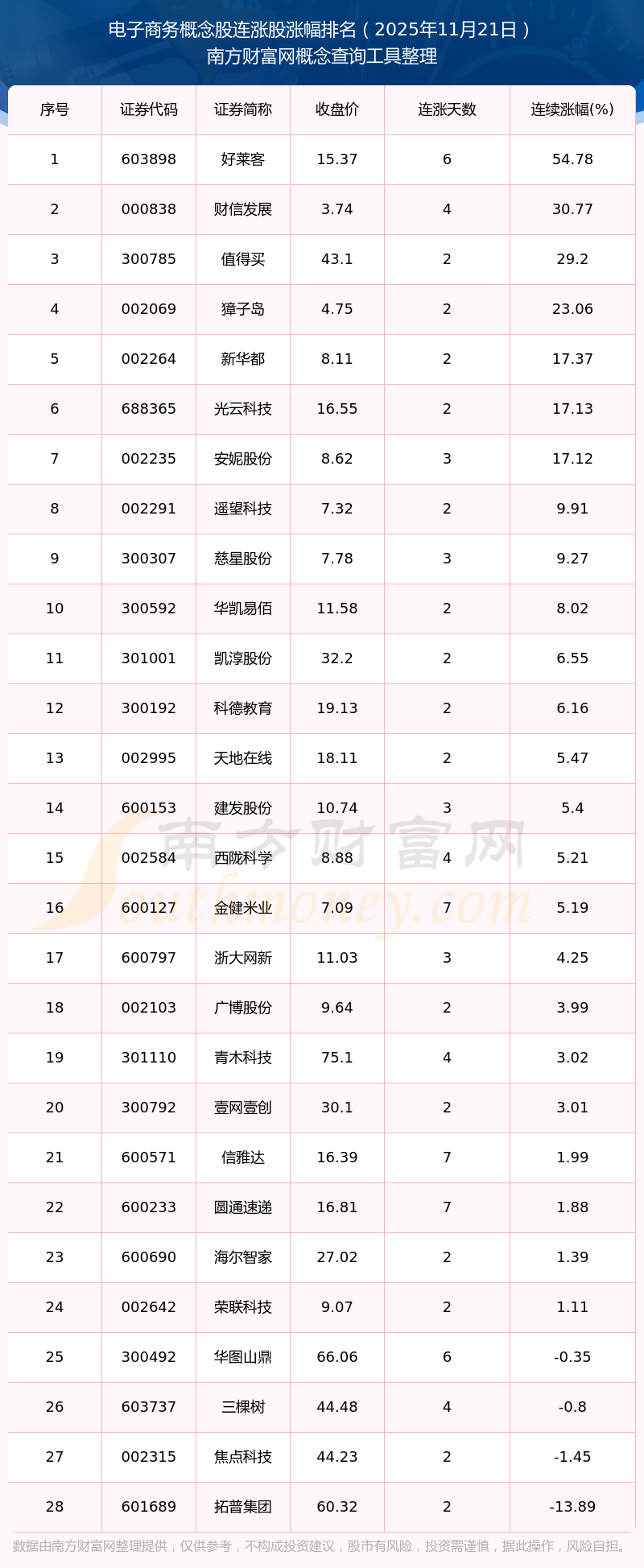 2025年11月21日電子商務(wù)概念股連漲股漲幅排名