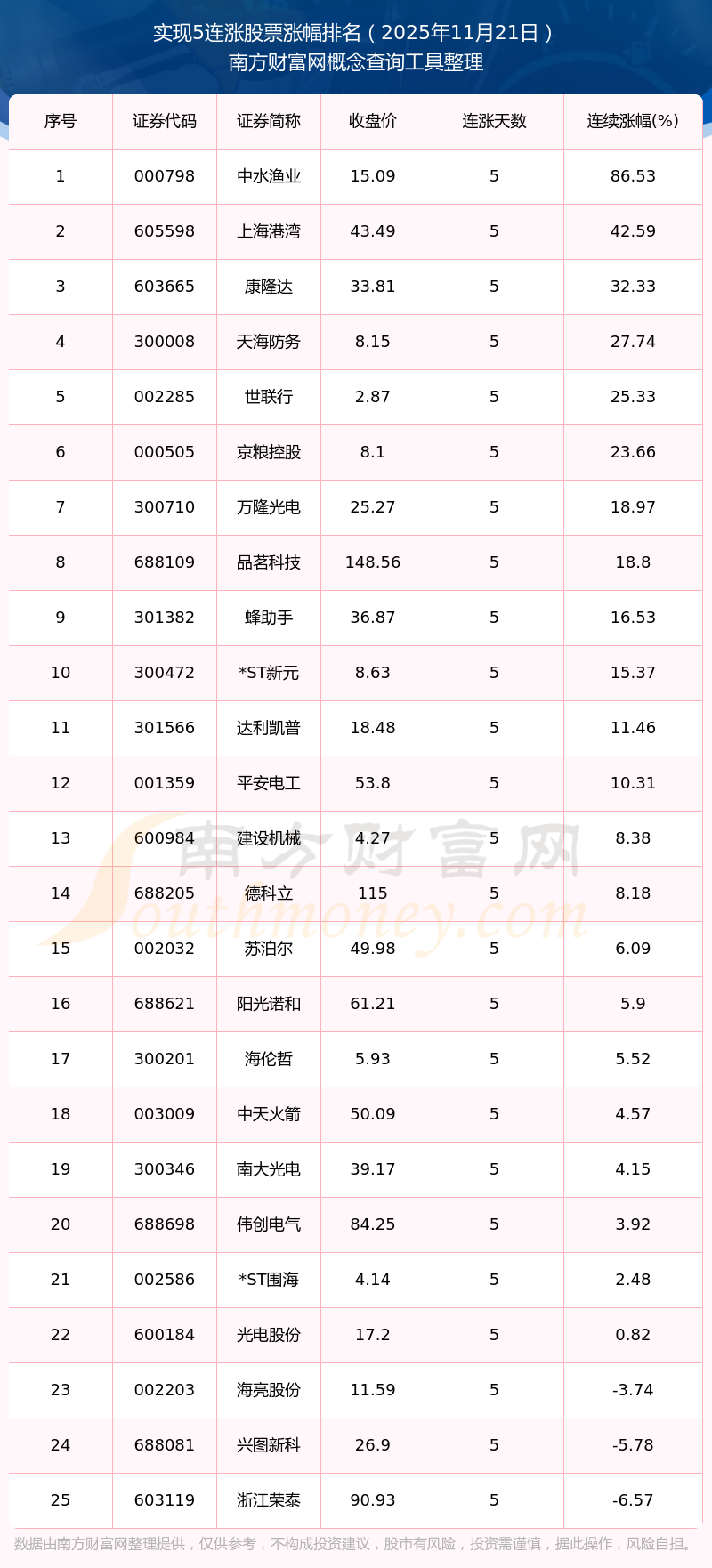 根據(jù)南方財(cái)富網(wǎng)概念查詢(xún)工具數(shù)據(jù)統(tǒng)計(jì),截止2025年11月21日收盤(pán),共有25只個(gè)股實(shí)現(xiàn)5天連漲。其中連續(xù)漲幅較大的個(gè)股有中水漁業(yè)、上海港灣、康隆達(dá)等,連續(xù)漲幅分別為86.53%、42.59%、32.33%。