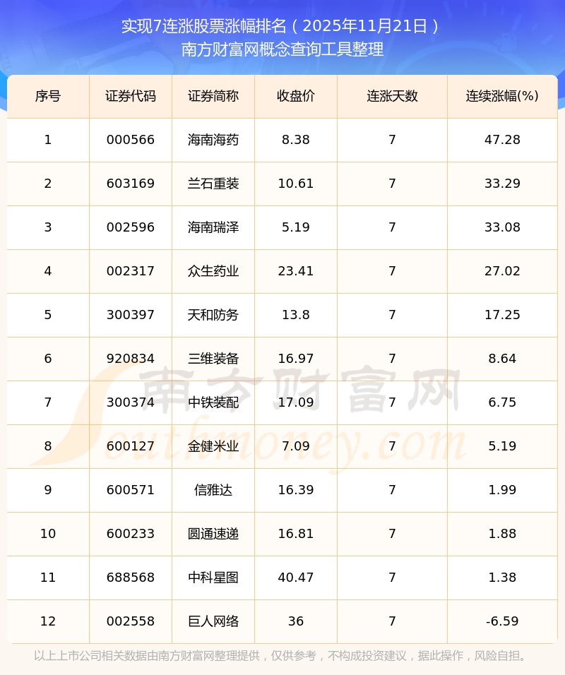 2025年11月21日實(shí)現(xiàn)7連漲股票漲幅排名