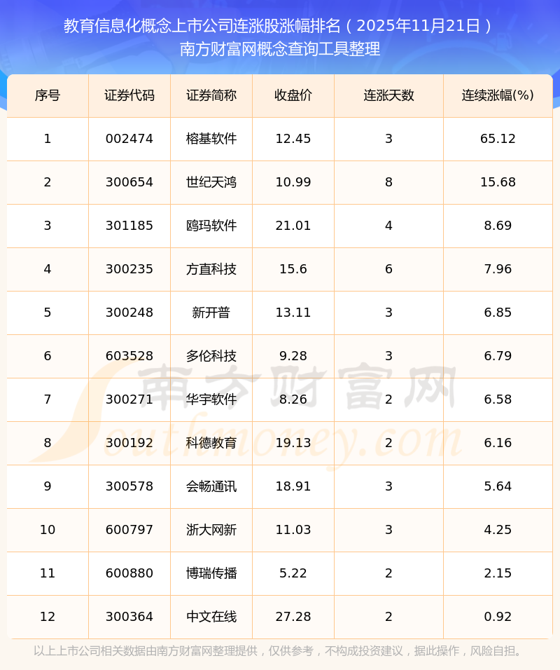 2025年11月21日教育信息化概念上市公司連漲股漲幅排名