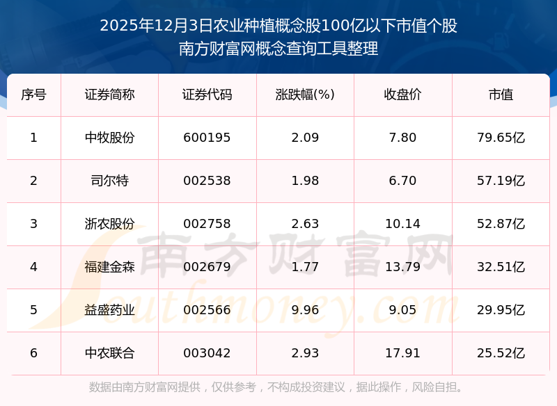 農(nóng)業(yè)種植概念股100億以下市值的個股有6家(2025年12月3日)