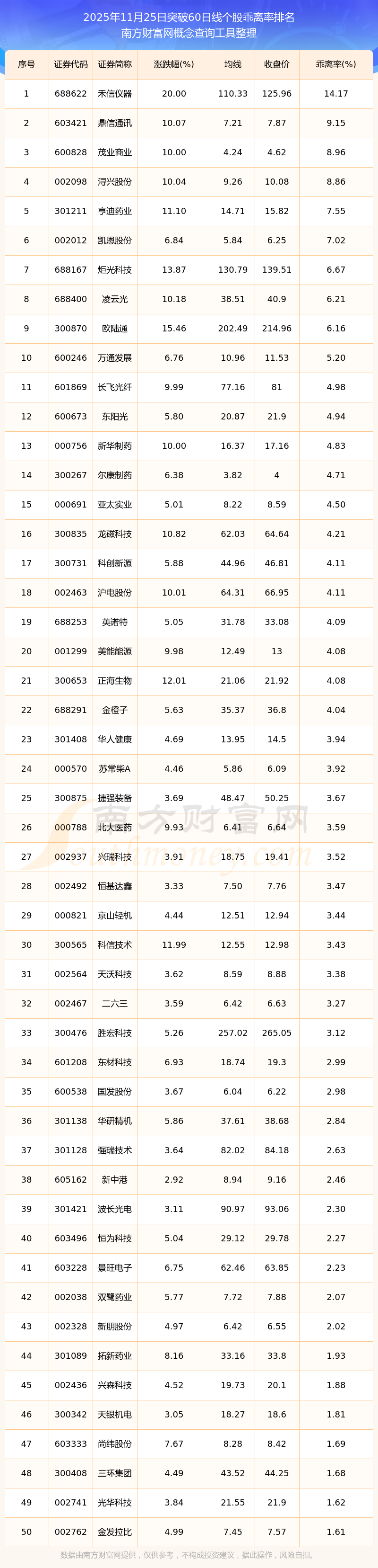 根據(jù)南方財富網(wǎng)概念查詢工具數(shù)據(jù)統(tǒng)計,截止2025年11月25日收盤,共有115只個股收盤價向上突破了30日線,其中乖離率較大的個股有茂業(yè)商業(yè)、正海生物、禾信儀器、北大醫(yī)藥、凱文教育等,乖離率分別為10.00%、8.46%、7.89%、7.10%、6.66%。 2025年11月25日突破3