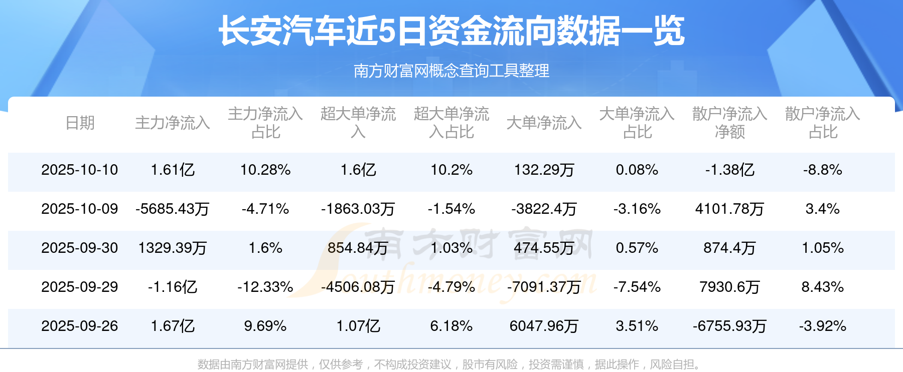 10月10日消息,長安汽車資金凈流入1.61億元,超大單資金凈流入1.6億元,換手率1.52%,成交金額15.66億元。