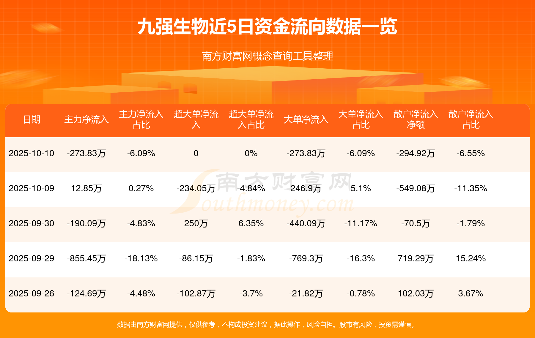 10月10日消息,九強生物10月10日主力資金凈流出273.83萬元,大單資金凈流出273.83萬元,散戶資金凈流出294.92萬元。