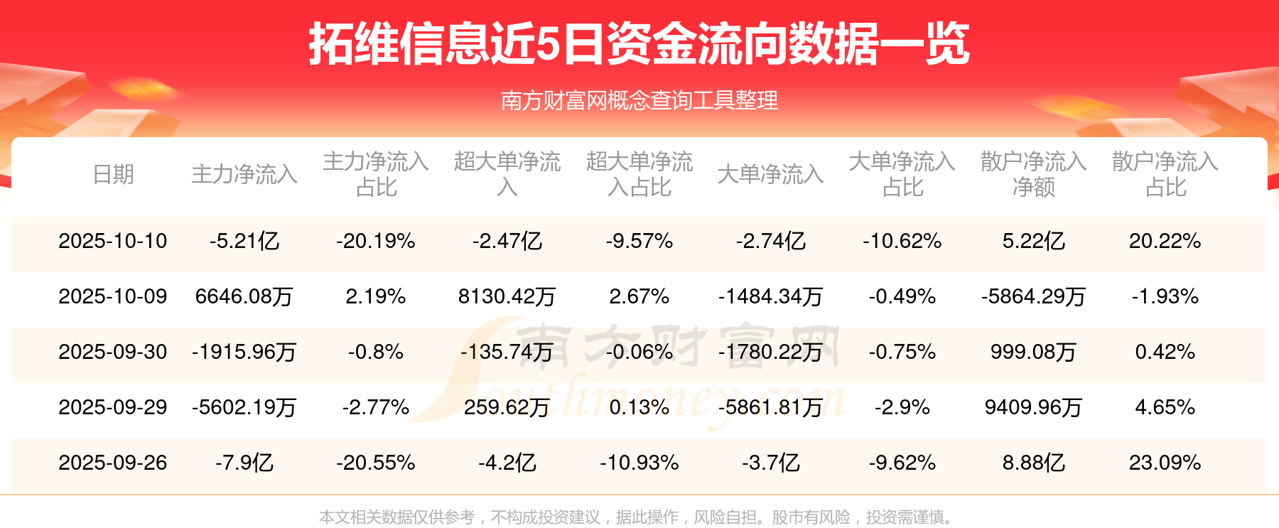 10月10日消息,拓維信息10月10日主力資金凈流出5.21億元,超大單資金凈流出2.47億元,大單資金凈流出2.74億元,散戶資金凈流入5.22億元。